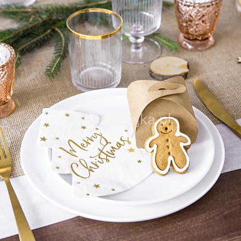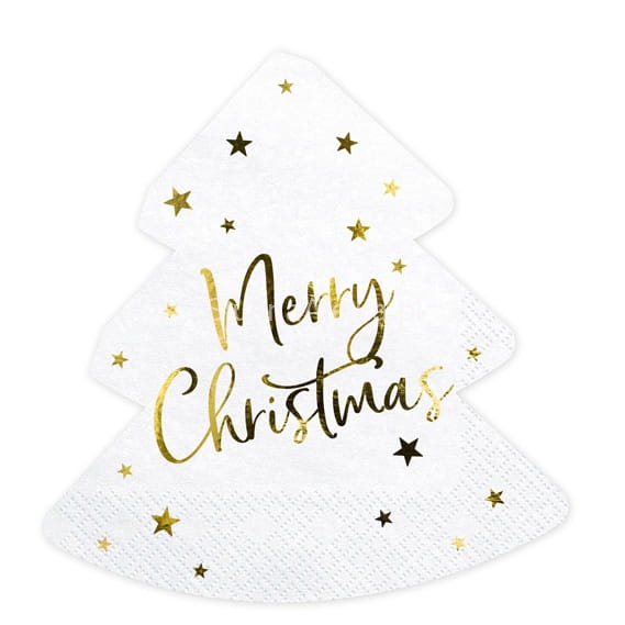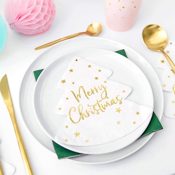 Serwetki papierowe w kształcie choinki z napisem Merry Christmas. Serwetki papierowe to bardzo wygodne i praktyczne serwetki, które służą na co dzień w każdej restauracji. W naszej ofercie posiadamy serwetki 3-warstwowe, które dodatkowo posiadają ozdobny nadruk. Dzięki temu są dekoracyjnym dodatkiem nawet podczas świąt, przyjęć i wesel. Pięknie prezentują się zarówno w naszych ozdobnych serwetnikach, jak i zwinięte w obrączkach na serwetki. Stają się wówczas ozdobą samą w sobie. Serwetki pomimo materiału, z jakiego są zrobione, są wytrzymałe i chłonne. W razie potrzeby można z nich również ułożyć restauracyjne origami. Uniwersalność serwetek papierowych to ich zdecydowana zaleta, dlatego ten produkt cieszy się w naszym sklepie ogromnym zainteresowaniem.