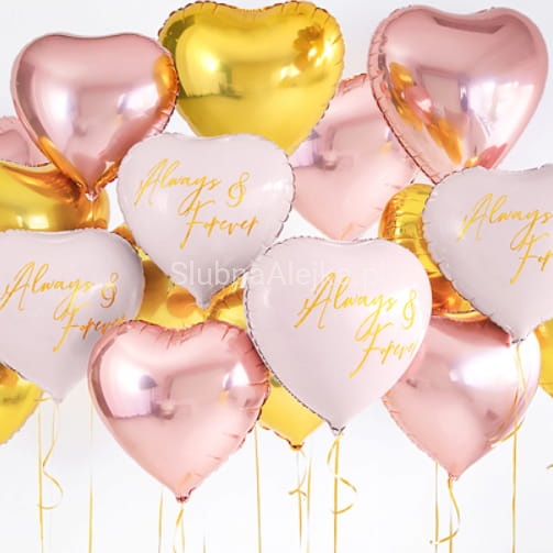 Balon weselny foliowy do napełniania helem lub powietrzem. Nadają lekkości i romantycznego charakteru całej aranżacji ślubnej. Można je wykorzystać, jako pojedynczy element dekoracyjny lub w zestawie kilku lub kilkunastu balonów zastosować, jako swoistego rodzaju bukiet kolorowych ozdób umiejscowionych w wysokich wazonach zamiast kwiatów. Balony weselne mogą tworzyć większe dekoracje takie jak: auto ślubne, bramy w wejściu na salę weselną lub ogromne serce zawieszone nad stołem, przy którym siedzą państwo młodzi.