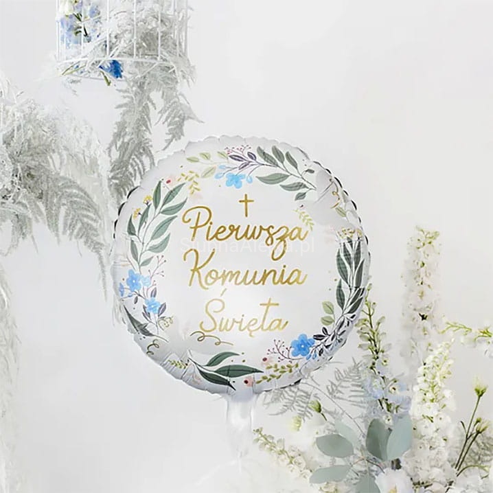 Matowy balon foliowy ''Pierwsza Komunia Święta'', mix kolorów, średnica przed napompowaniem ok. 45 cm (18''), średnica po napompowaniu ok. 35 cm (14''). Do napompowania powietrzem i helem. Zestaw zawiera słomkę.
