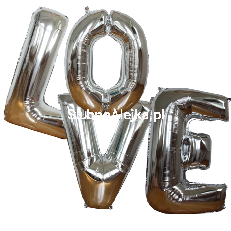 Cztery balony foliowe na hel złożone z liter tworzących napis LOVE. Można umieścić go zarówno w sali weselnej przy stole Państwa Młodych, jak i w ogrodowym namiocie, czy na tarasie. Napis ułożony z połyskujących balonów znakomicie prezentuje się również jako dopełnienie Candy Baru i Drink Baru. Z powodzeniem można go wykorzystać do ślubnej sesji zdjęciowej, narzeczeńskiej lub do foto budki. Balony można również wykorzystać, jako prezent dla Młodej Pary lub bliskiej osoby. Dzięki specjalnym zaczepom można go łatwo podwiesić za pomocą wstążki. Napis występuje zarówno w wersji srebrnej, jak i złotej.