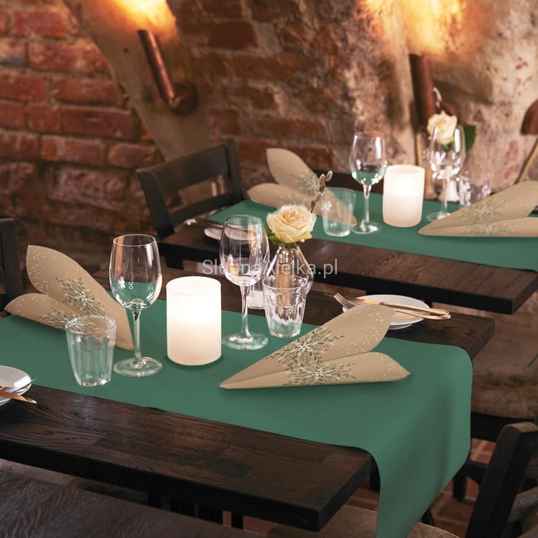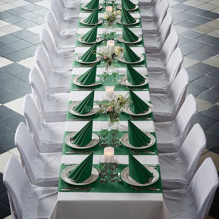 Dzięki bieżnikom flizelinowym Dunicel, dostępnym w szerokiej gamie kolorystycznej stworzysz nakrycia stołu będące kwintesencją elegancji. Flizelinowy materiał jest lekki i pięknie dopasowuje się do kształtu stołu. Może bowiem pokrywać zarówno weselne okrągłe stoły, jak i podłużne, prezydialne. Bieżnik Dunicel jest gotowy do położenia na stole i łatwy w użyciu dzięki perforacji. Sprawdzi się przede wszystkim na podłużnych stołach na sali bankietowej. Dzięki niemu stół wygląda wytwornie, a kolorystyka zostaje przełamana, dodając charakteru całej aranżacji. Bieżnik wygodnie rozwija się z rolki. Dzięki temu przygotowania do przyjęcia przebiegają szybko i sprawnie. Bieżnik pięknie komponuje się z całą kolekcją Dunicel. Całość dopełnią serwetki flizelinowe, papierowe i kieszonki o tym samym wzorze.