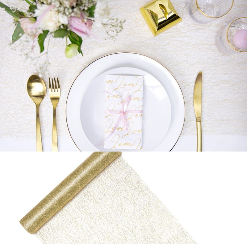 Siatka dekoracyjna - fibra złota przypominająca wzorem pajęczynkę. Bieżnik na rolce, gotowy do położenia na stole. Sprawdzi się przede wszystkim na podłużnych stołach na sali bankietowej. Doda lekkości i delikatności całej aranżacji stołu. Dzięki niemu stół wygląda niezwykle elegancko, a kolorystyka zostaje delikatnie przełamana. Bieżnik ma tyle wersji kolorystycznych, że z łatwością można dobrać odpowiedni odcień do otaczających stół dodatków. Siatka jest lekkim materiałem, który bardzo wygodnie rozwija się z rolki. Dzięki temu przygotowania do wesela, czy przyjęcia w restauracji przebiegają szybko i sprawnie.
