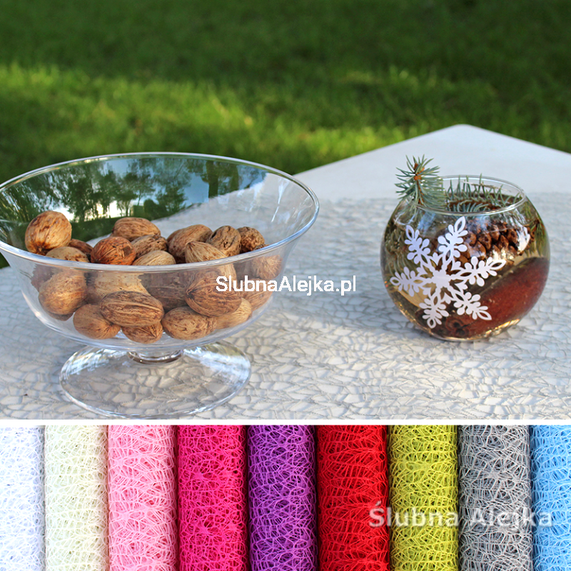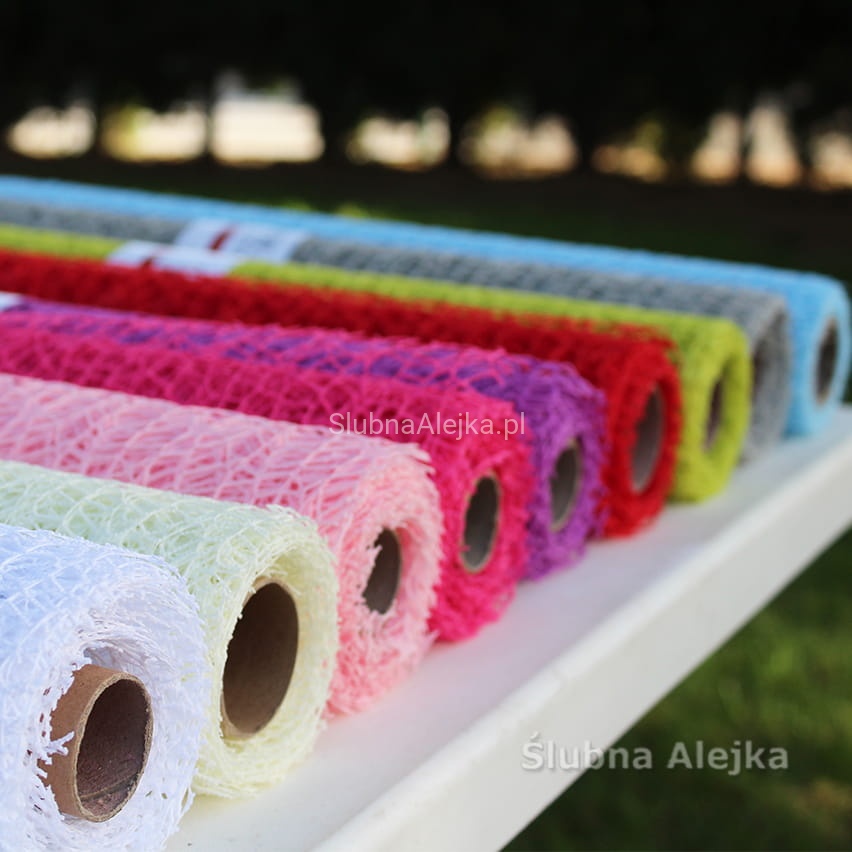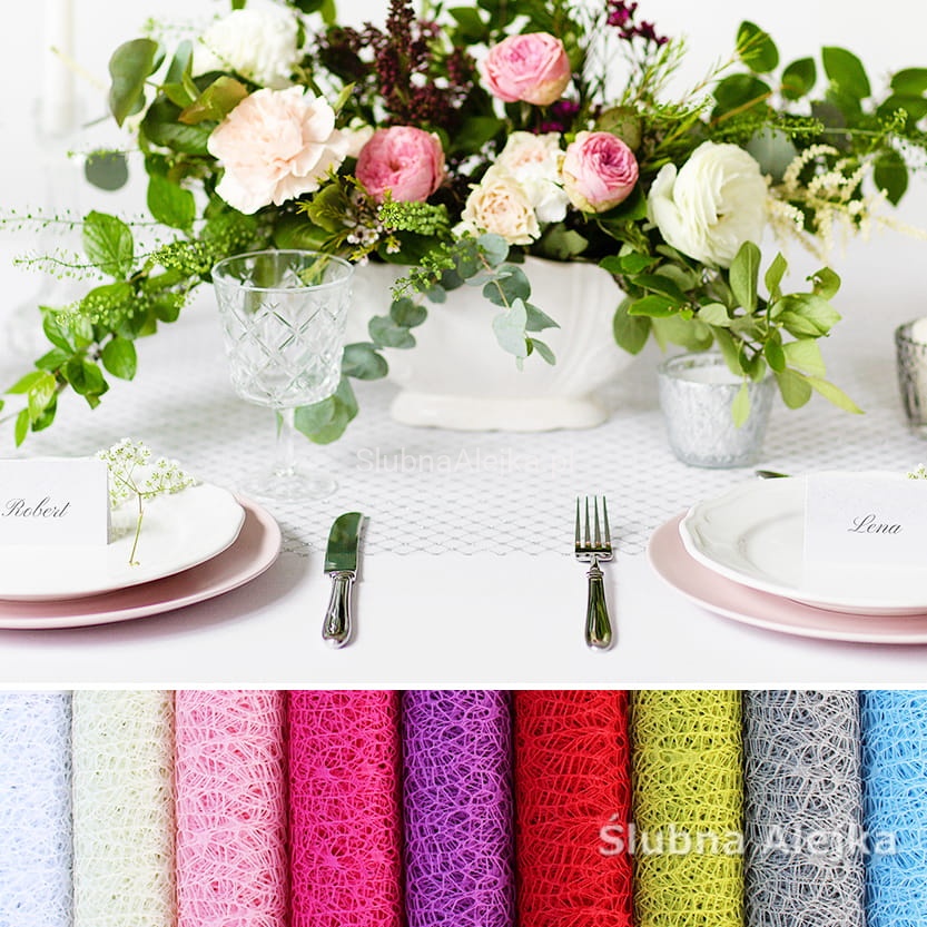 Siatka florystyczna na rolce to gotowy do położenia na stole bieżnik. Sprawdzi się przede wszystkim na podłużnych stołach na sali bankietowej. Dzięki niemu stół wygląda niezwykle elegancko, a kolorystyka zostaje przełamana, dodając charakteru całej aranżacji. Bieżnik ma bowiem tyle wersji kolorystycznych, że z łatwością można dobrać odpowiedni odcień do otaczających stół dodatków. Siatka jest lekkim materiałem, który bardzo wygodnie rozwija się z rolki. Dzięki temu przygotowania do wesela przebiegają szybko i sprawnie. Podobnie jak sprzątanie po przyjęciu.