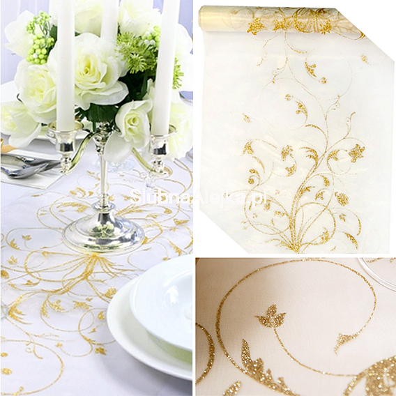 Bieżnik z wyjątkowym, delikatnym wzorem znakomicie prezentuje się na stołach weselnych. Forma, w jakiej zostało zaprojektowane zdobienie romantycznie wije się na obrusach, które są dla bieżnika tłem podkreślającym jego urok. Delikatna tkanina, z jakiej został zrobiony, niemalże stapia się z podłożem, wyglądając jedynie jak zdobienie. Bieżnik jest zatem elegancką i dyskretną dekoracją ślubną, dodającą świątecznego nastroju, bez względu na to, czy jest to impreza okolicznościowa, czy obiad bożonarodzeniowy. Oprócz tego, że stanowi ozdobę wyznacza także miejsce, na którym mogą stanąć potrawy. Dzięki temu stół wygląda nie tylko wytwornie, ale jest także uporządkowany.