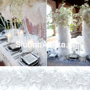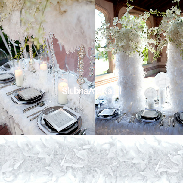 Boa z piór jako dekoracja sali weselnej jest oryginalną, zwiewną i wyjątkową ozdobą ślubną. Nadaje lekkości i romantycznego charakteru każdemu elementowi wyposażenia. Boa można owinąć wokół wazonów, świeczników, lampionów, o ile nie ma bezpośredniego kontaktu z ogniem. Gama kolorystyczna jest na tyle bogata, że spokojnie można dobrać odcień boa do ogólnej aranżacji sali. Przepięknie prezentuje się w kompozycjach florystycznych, szczególnie kiedy zestawimy ze sobą kontrastujące kolory, np. biel z zielenią. Boa pięknie wygląda również w szklanym wazonie wraz z lampkami LED, tworząc niemalże anielską ozdobę.