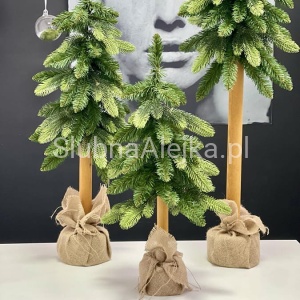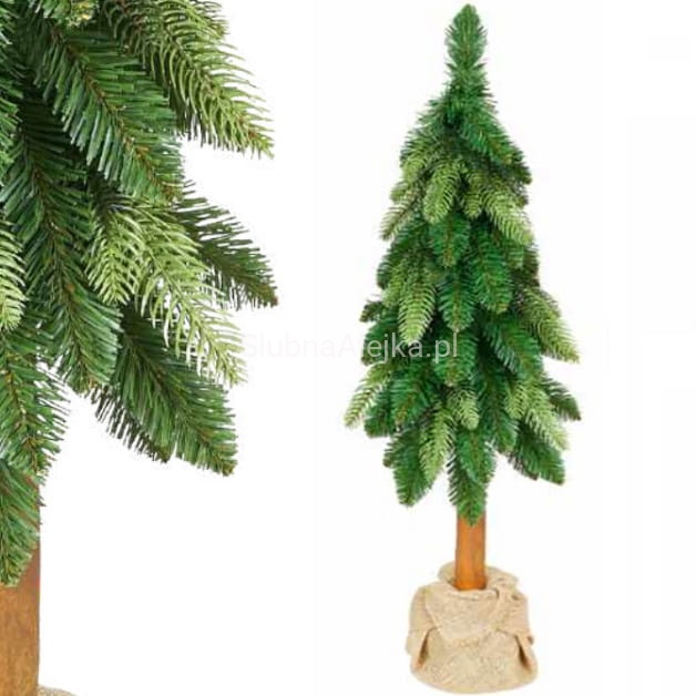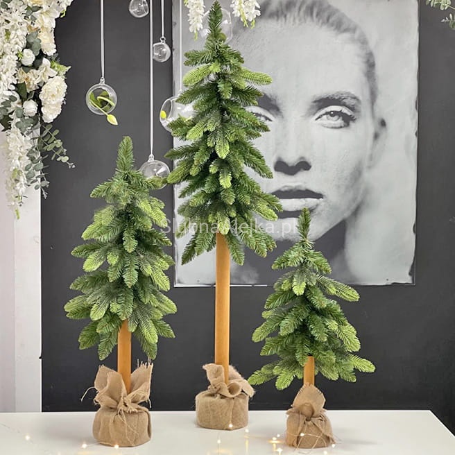 Choinkę zieloną na naturalnym pniu charakteryzuje przede wszystkim jej oryginalna forma. Choinka składa się z zielonej korony i naturalnego pnia sosny zwieńczonego stabilną donicą owiniętą w jutę zawiązaną jutowym sznurkiem. Pień sosny został ozdobiony gęstymi gałązkami świerkowymi z żywo-zielonego tworzywa PE, znakomicie imitującego naturalne igliwie. To połączenie powoduje, że choinka zielona na naturalnym pniu bez względu na rozmiar wspaniale uzupełnia bożonarodzeniowe dekoracje.
