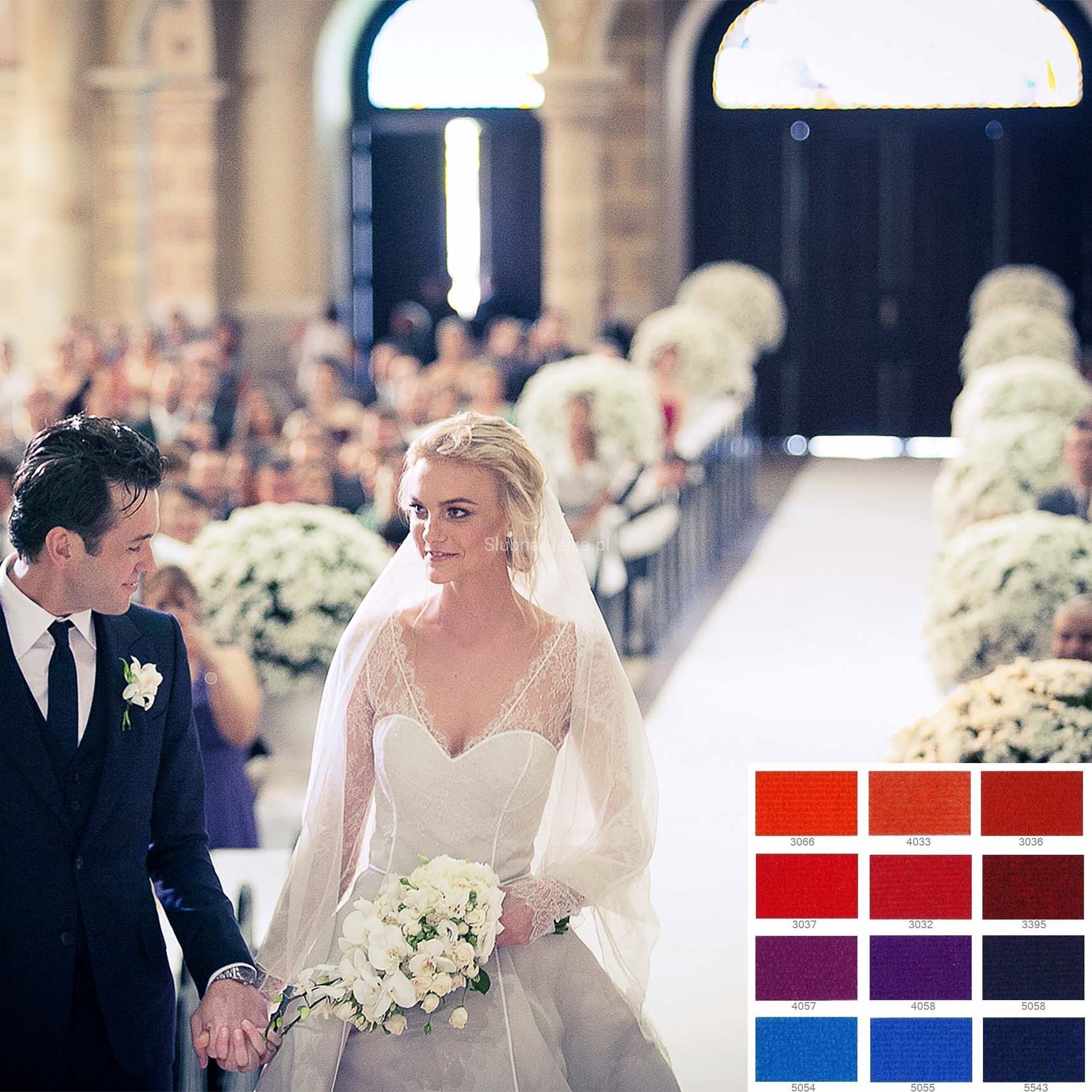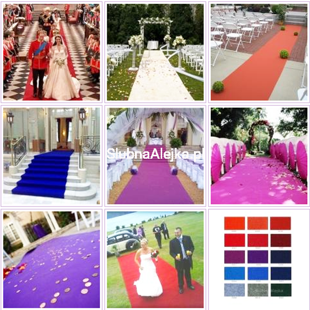 Dywan ślubny jako dekoracja kościoła zwykle rozkładany jest przed wejściem do świątyni, wyznaczając drogę Państwa Młodych wprost do miejsca zaślubin. Oprócz swojej funkcji dekoracyjnej spełnia także funkcję praktyczną, chroniąc przed niekontrolowanym upadkiem i uszkodzeniem sukni ślubnej. Obcasy nie zapadają się bowiem w nieoczekiwanych miejscach, a tren nie jest narażony na zabrudzenia i podarcie. Całej uroczystości, bez względu na to, czy jest organizowana w kościele, czy w plenerze, nadaje podniosły i iście królewski charakter. Dywan ślubny, który posiadamy w naszej ofercie został wykonany z tkanej wykładziny dywanowej, posiadającej certyfikat higieniczny oraz atest trudnopalności. Jej ogromną zaletą jest łatwość, z jaką można ją rozwinąć w krótkim czasie. Dywan nie jest podgumowany.