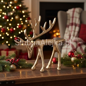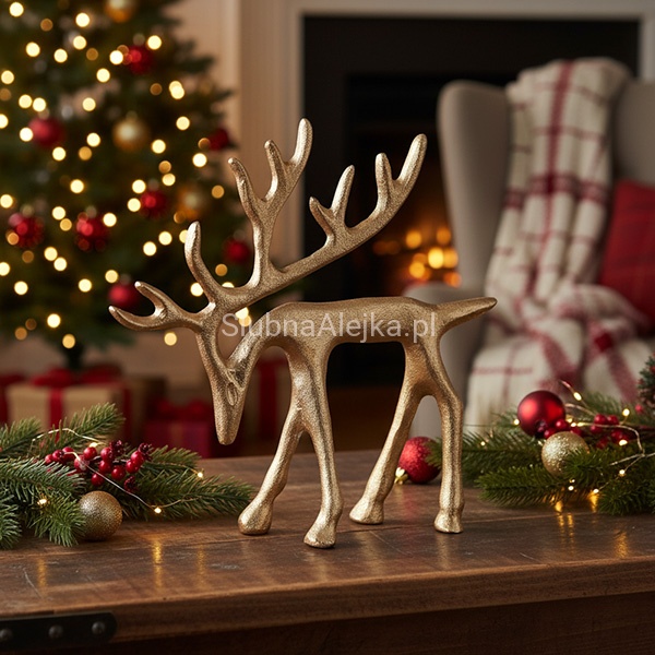 Święta Bożego Narodzenia to czas, w którym symbolika ma ogromne znaczenie, szczególnie jeśli chodzi o dekoracje wnętrz. Od świeczki po zawieszki – wszystkie elementy dobieramy od kątem kolorystycznym oraz występujących na nich symbolach takich jak: renifery, Święty Mikołaj, bałwanki, choinki, czy gwiazdki. Dlatego właśnie uroczy metalowy renifer w pięknym złotym wydaniu będzie idealną ozdobą świątecznego wnętrza w stylu klasycznym, industrialnym, czy loftowym. Wniesie odrobinę magii i luksusu do salonu, jadalni czy sypialni. Wykonany z metalu, malowany proszkowo. Będzie również świetnym pomysłem na świąteczny podarunek.