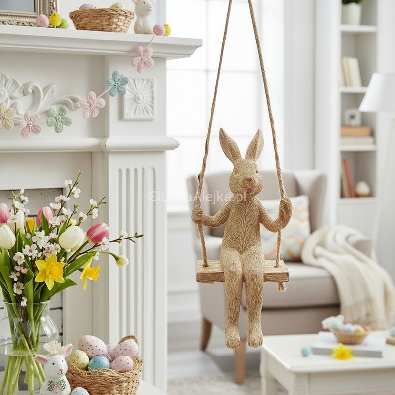 Figurka Zając na Huśtawce z funkcją bujania to wyjątkowo uroczy dodatek, który zainteresuje wszystkich miłośników pięknych dekoracji. Jej delikatna forma sprawia, że może być wykorzystana w dekoracjach wielkanocnych. Wykonana z dbałością o każdy szczegół figurka łączy w sobie funkcjonalność i estetykę, doskonale wpisując się w atmosferę Świąt Wielkanocnych. Trwały materiał, z jakiego została wykonana, nadaje ciepłego, rustykalnego charakteru, a zajączek subtelnie kołyszący się na huśtawce przyciąga wzrok i dodaje aranżacji ciepła oraz bajkowego uroku.