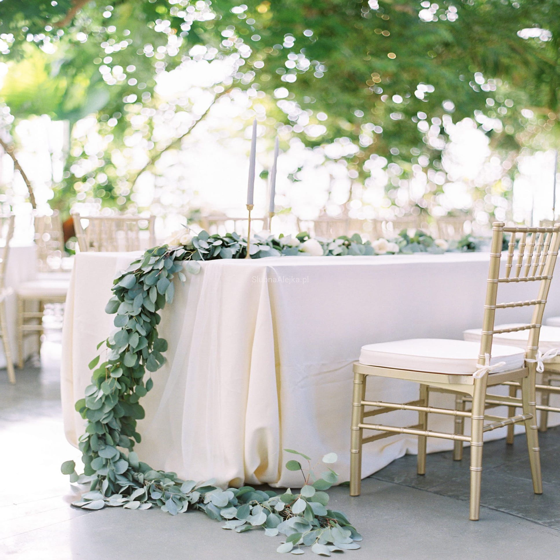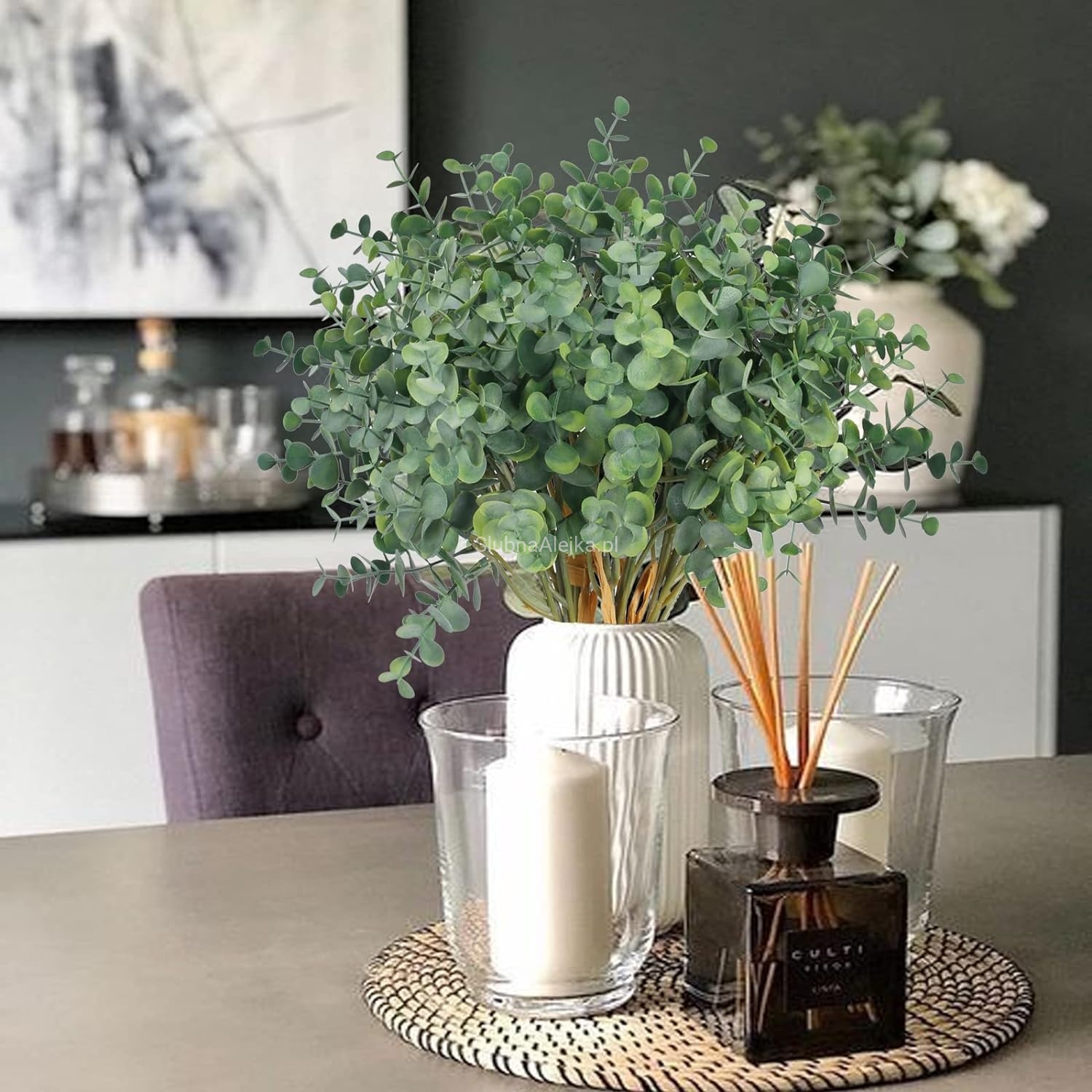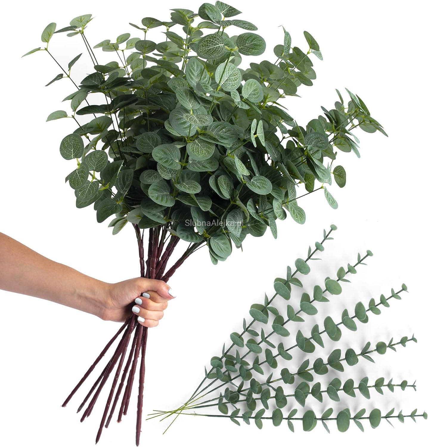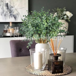 Gałązka dekoracyjna Eukaliptus 60 cm to uniwersalny dodatek, który można wykorzystać do dekoracji dowolnie wybranych miejsc. Sprawdzi się także jako forma wisząca do dekoracji sufitu, filarów, czy ścian. Można układać ją również na stołach. Rozmieszczenie kilku gałązek jest dowolne, ale najbardziej popularne jest umieszczenie ich w eleganckich wysokich wazonach z dodatkiem świeżych kwiatów zarówno w sali weselnej, jak i pod namiotem ogrodowym, czy w altanie. Oprócz tego gałązki mogą leżeć na stołach i upiększać np. Candy Bar. Prosta i bardzo modna dekoracja każdej eleganckiej uroczystości.