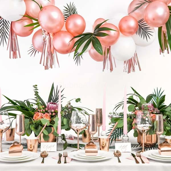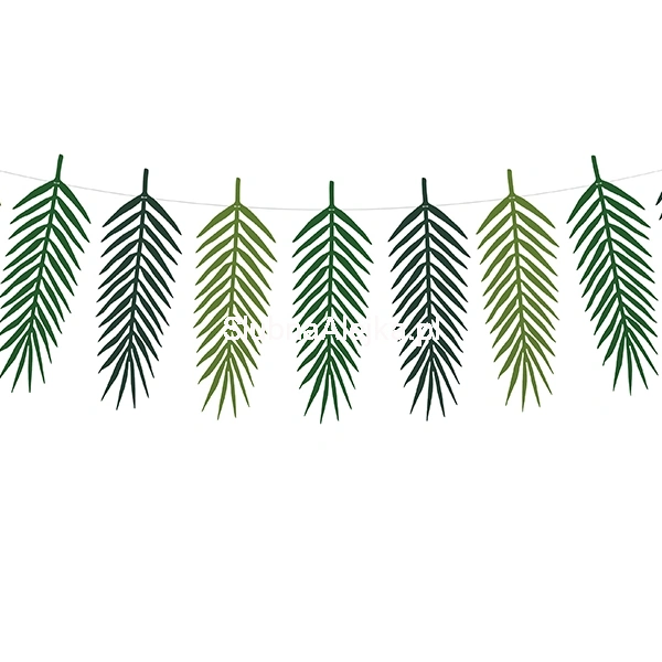 Dekoracje papierowe Aloha wycinane laserowo. Zestaw do samodzielnego złożenia zawiera zawiera 9 liści tropikalnych w trzech odcieniach zieleni oraz żyłkę. Pięknie ozdobią salę urodzinową w klimacie hawajskim.