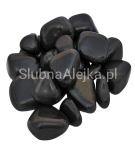 Kamienie Dekoracyjne Otoczaki z Połyskiem Czarne to błyszczący gadżet dekoracyjny używany przez florystów do tworzenia eleganckich dekoracji na stoły weselne. Gładka powierzchnia kamieni i głęboki, czarny kolor dodają szyku każdej kompozycji florystycznej. Kamyki mają naturalne, nieregularne kształty, wielkość pojedynczego kamienia to ok. 3-4 cm. Otoczaki pakowane są w siatkę po 1 kg.