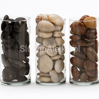 Czarne otoczaki warto wyeksponować w szklanych naczyniach do aranżacji w zestawieniu z innymi ozdobnymi kamieniami, tworząc warstwową dekorację w kilku kolorach.