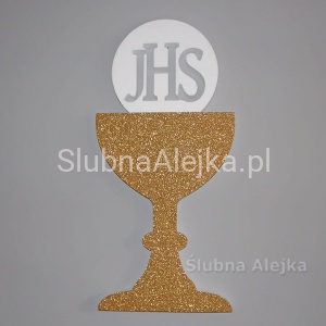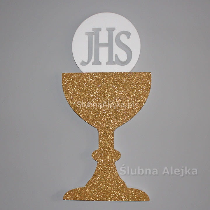 Bardzo estetyczna dekoracja w kształcie kielicha na I-szą Komunię Świętą. Kielich wykończony złotym brokatem. Wielkość napisu IHS wynosi 10 cm. Bardzo lekka i łatwa do powieszenia ozdoba. Wystarczy podwiesić na żyłce lub podpiąć szpileczkami. Będzie wspaniałą ozdobą przyjęcia komunijnego, czy kościoła. Wykonana z dobrego, zbitego styropianu ciętego termicznie. Dzięki temu kulki tworzą gładką powierzchnię i nie sypią się. Wszystkie nasze dekoracje komunijne są wykonane z wysokiej jakości materiałów.