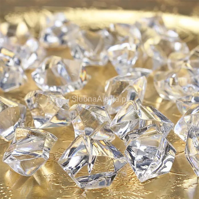 Kryształowy Lód – WYBIERZ KOLOR z szerokiej gamy ozdobnych kryształków przypominających lód! Kryształowy lód to wykonane z barwionego, transparentnego akrylu kamyczki o wielkości ok. 2,5 x 2,1 cm. Kryształowy lód jest stosowany do ozdabiania dekoracji na stoły weselne. Lód jest pakowany w foliowe rożki, dzięki którym ich umieszczanie w szklanych naczyniach jest niezwykle łatwe.