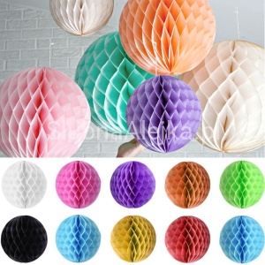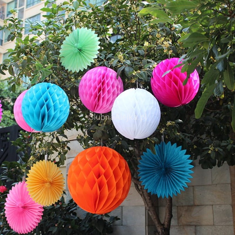 Kula bibułowa plaster miodu to niezwykła i oryginalna dekoracja ślubna(honeycomb). Bardzo szybko i łatwo się ją rozkłada oraz montuje. Wystarczy jedynie żyłka, aby podwiesić kule pod sufitem w wybranej konfiguracji. Ze względu na różnorodność kształtów i kolorów kule tworzą niepowtarzalne aranżacje, które można dodatkowo iluminować poprzez specjalne oświetlenie. Udekorują zarówno salę weselną, jak i namiot ogrodowy. Oferowane przez nas kule są składane i można je przechowywać przez kolejne lata. Aby odświeżyć kolor wystarczy omieść je zmiotką do kurzu. W naszym sklepie proponujemy Państwu bogatą paletę barw, nie tylko nawiązującą do dekoracji ślubnych, ale pasującą również do każdego innego rodzaju imprezy.