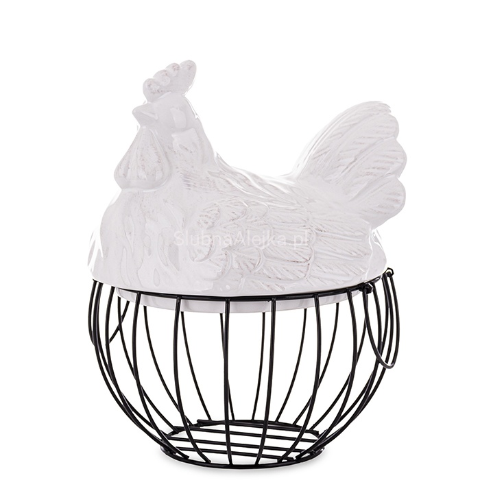 Ten uroczy koszyk dekoracyjny w kształcie kury to doskonała ozdoba, która wprowadzi do Twojego wnętrza wielkanocny, rustykalny akcent. Kosz wykonany z metalowego materiału o czarnej barwie doskonale komponuje się z białą ceramiczną pokrywką w kształcie kury.