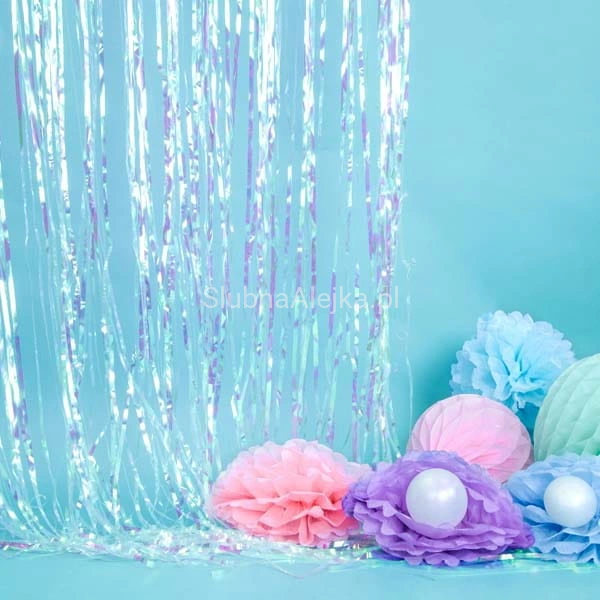 Kurtyna Party w kolorze opalizującym. Najpopularniejszym zastosowaniem kurtyny jest podwieszenie jej w centralnym miejscu sali urodzinowej.Tworzy wówczas przestrzenną instalację, którą można podświetlić wielobarwnymi halogenami, zmieniając z minuty na minutę atmosferę z romantycznej na rockową. Kurtynę można umieścić również nad wejściem do restauracji, czy hotelu. Z pewnością doda lekkości i elegancji każdemu pomieszczeniu.