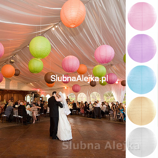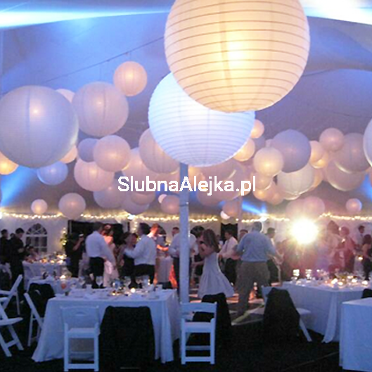 Piękne kuliste lampiony wykonane z papieru ryżowego. Bardzo efektowna i niedroga dekoracja do podwieszania zarówno na sali tanecznej, jak i w ogrodzie lub na tarasie gdzie odbywa się przyjęcie plenerowe.