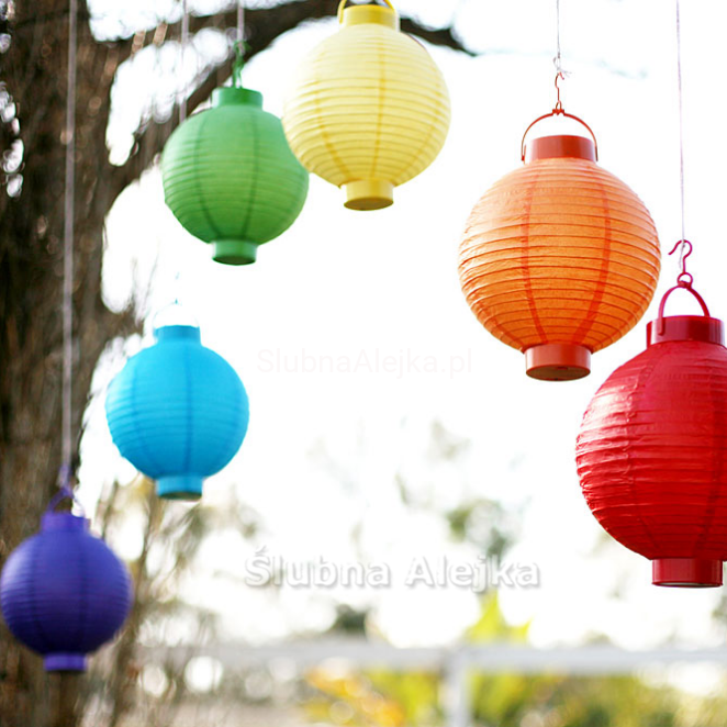 Piękne kuliste lampiony wykonane są z papieru ryżowego. Bardzo efektowna i niedroga dekoracja do podwieszania w ogrodzie lub na tarasie gdzie odbywa się przyjęcie plenerowe.