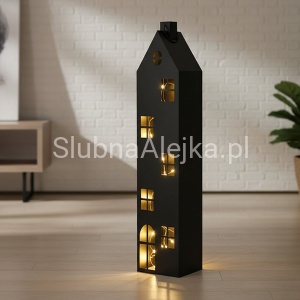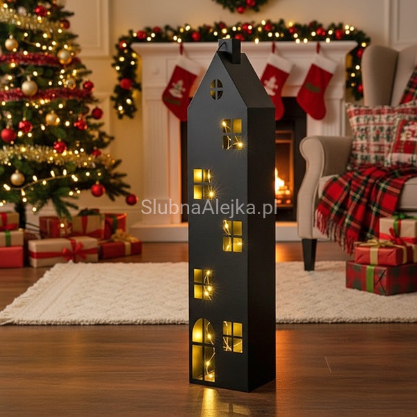 Latarnia domek 90 cm wykonana z czarnego, mocnego metalu to wyjątkowa i praktyczna dekoracja, która sprawdzi się zarówno w okresie świątecznym jaki i w ciągu całego roku by nadać wnętrzu stylu i wyjątkowej atmosfery. Doda luksusu na każdym tarasie, czy balkonie z odpowiednio zaaranżowaną przestrzenią i lampkami.