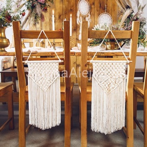 Makrama to przepiękna dekoracja wykonana ręcznie w stylu vintage, którą można wykorzystać do dekoracji dowolnie wybranych miejsc. Sprawdzi się doskonale jako forma wisząca do dekoracji krzeseł, sufitu, filarów, czy ścian. Rozmieszczenie kilku dekoracji jest dowolne, ale najbardziej popularne jest zawieszenie ich w podobnych odcieniach kolorystycznych pod sufitem zarówno w sali weselnej, jak i pod namiotem ogrodowym, czy w altanie. Po zakończonej uroczystości girlandy można schować i zabezpieczyć przed kolejnym weselem.