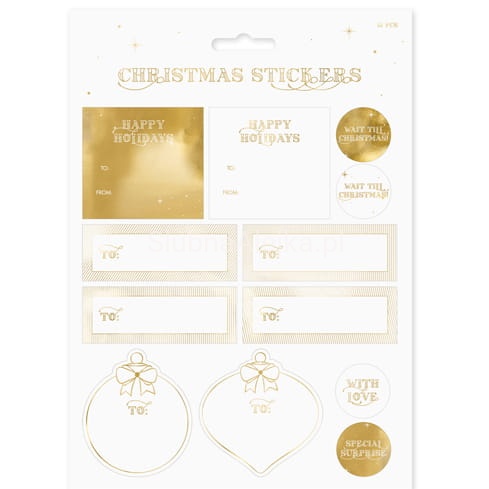 Naklejki świąteczne, mix wzorów w złotym kolorze, zestaw zawiera 12 naklejek na blistrze, wymiary ok. 6.5-8.5 x 3-6.5 cm.