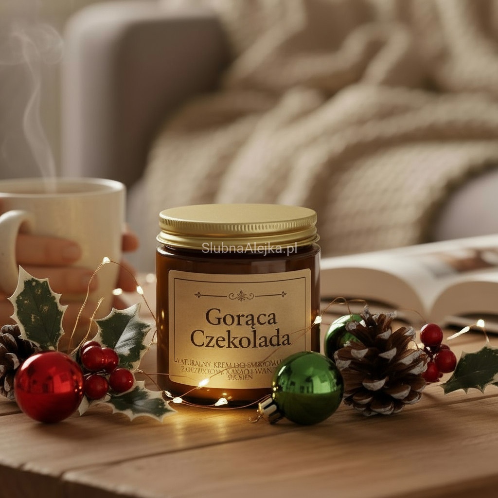 Naturalna Świeca Sojowa w stylowym słoiczku z drewnianym knotem o pięknym zapachu Gorąca Czekolada to niezwykla urokliwa ozdoba całoroczna oraz świetny pomysł na prezent. Każda świeca wykonana jest ręcznie i bardzo precyzyjnie z wosku sojowego oraz certyfikowanych olejków zapachowych. Bez dodatków chemicznych i szkodliwych substancji, świeczki te pozwalają na skupienie się na odpoczynku, a przy okazji tworzą wyjątkową aurę w naszych domach. Ozdobią każde wymagające wnętrze. Po świece sięgamy także wyjątkowo chętnie w okresie świątecznym. Towarzyszą nam zwykle podczas długich rodzinnych spotkań, budując przytulny i ciepły nastrój wnętrz. Wyjątkowo mocno kojarzą się z czasem świątecznym.