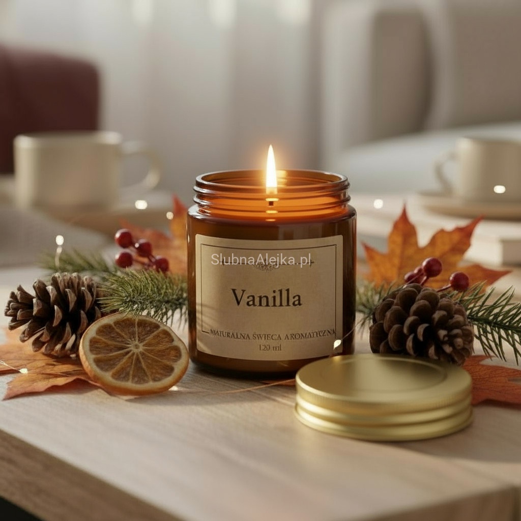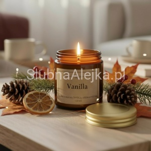 Naturalna Świeca Sojowa w stylowym słoiczku z drewnianym knotem o pięknym zapachu Vanilla to niezwykla urokliwa ozdoba całoroczna oraz świetny pomysł na prezent. Każda świeca wykonana jest ręcznie i bardzo precyzyjnie z wosku sojowego oraz certyfikowanych olejków zapachowych. Bez dodatków chemicznych i szkodliwych substancji, świeczki te pozwalają na skupienie się na odpoczynku, a przy okazji tworzą wyjątkową aurę w naszych domach. Ozdobią każde wymagające wnętrze. Po świece sięgamy także wyjątkowo chętnie w okresie świątecznym. Towarzyszą nam zwykle podczas długich rodzinnych spotkań, budując przytulny i ciepły nastrój wnętrz. Wyjątkowo mocno kojarzą się z czasem świątecznym.