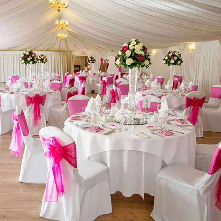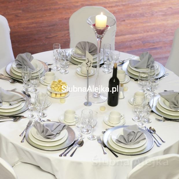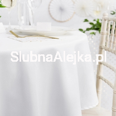 Biały obrus na stół weselny jest klasycznym obrusem, ale przeznaczonym na stoły okrągłe. Wykonany z matowego, gładkiego i plamoodpornego materiału stanowi eleganckie wykończenie pod ślubną zastawę oraz dekoracje. Ze względu na swój kształt bardzo łatwo rozkłada się go na stołach, bez konieczności dodatkowego dopasowywania. Obrus ma średnicę nieco większą niż stół, a zatem zwisając nadaje mu masywną formę i wytworny fason. Na białym tle znakomicie prezentują się porcelanowe talerze i szklane naczynie. Nie ma tez przeciwwskazań, aby zastawa była w kolorach kontrastowych. Wszystko zależy od dekoratora wnętrz, jednak biel w kontekście ślubnym zawsze pasuje do innych elementów dekoracyjnych.