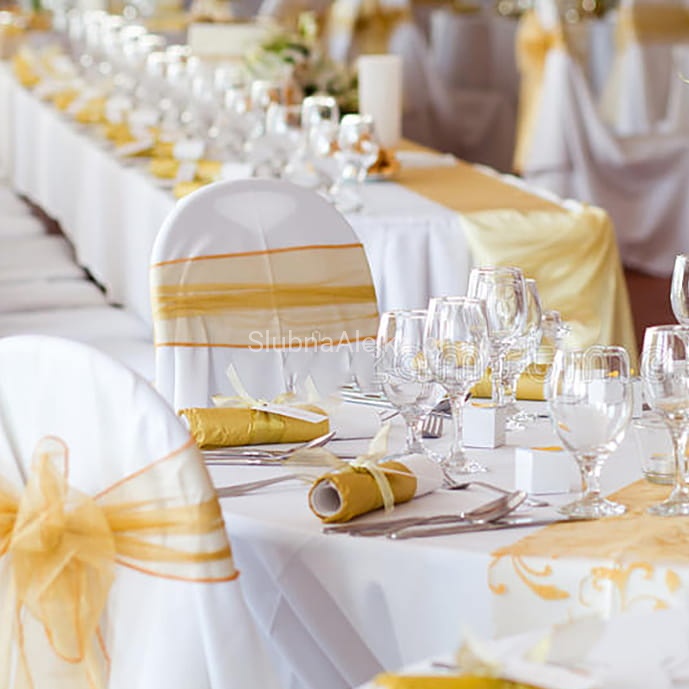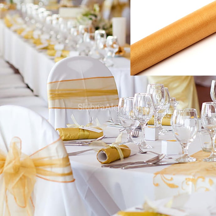 Organza złota do dekoracji to materiał ozdobny, niezwykle łatwo układający się w rozmaite wzory i prosty do zamocowania zarówno na powierzchniach takich jak kolumny, czy większe dekoracje kościoła, np. florystyczne. Materiał swoją delikatność zawdzięcza technologii wykonania. Kiedyś wykonywany z przędzy jedwabnej – dziś także z bawełny i włókien syntetycznych, zachowuje trwałość i połysk przez lata. Można zamocować ją wzdłuż nawy głównej, ale także na limuzynie lub na stole weselnych. Sposoby na jej wykorzystanie można mnożyć. Jest delikatna i przezroczysta, co sprawia, że idealnie nadaje się do aranżacji ślubnych, ale także do dekoracji sal bankietowych i restauracji.