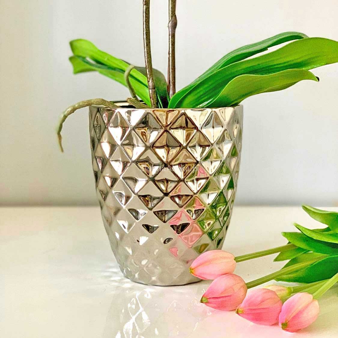 Osłonka z ceramiki szkliwionej storczykówka pasuje do stylu glamour i industrialnych wnętrz. Wspaniale koresponduje z połączeniem: beton, szkło i metal.