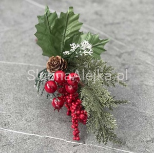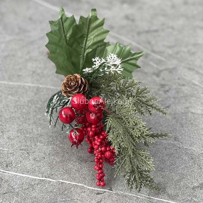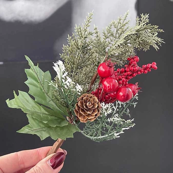 Oferujemy Państwu owoce leśne na piku z szyszką wykonane ze sztucznych gałązek świerkowych z pięlnymi, czerwonymo owocami. Najczęściej stanowi bazę do wszelkich kompozycji florystycznych, ale może być także samodzielną ozdobą świąteczną. Do stosowania w domu, jak i na zewnątrz jako ozdoba tarasu, czy ogrodu. Łatwo przymocować go do wianka świerkowego lub girlandy. Praktyczna i trwała ozdoba świąteczna.