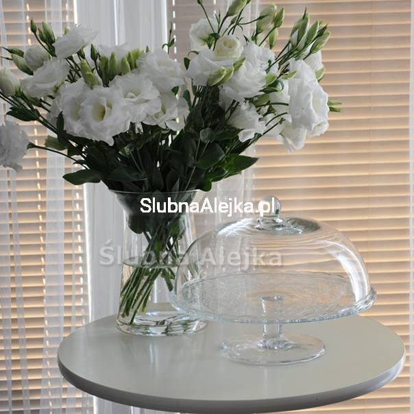 Patera szklana na Candy Bar z kloszem sprawdzi się także jako naczynie, jak i ozdoba ślubna w Candy Barze. Oprócz słodkości można ustawić na niej świece, figurki lub dodatki okolicznościowe. W razie konieczności można przystroić ją lekko wstążeczką wokół nóżki.