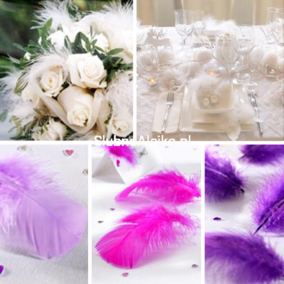 Piórka dekoracyjne to ozdoba ślubna przeznaczona szczególnie dla tych, którzy lubią romantyczną atmosferę na sali weselnej. Kolorystyka, w jakiej proponujemy Państwu piórka idealnie pasuje do bieli kojarzonej głównie z ceremonią zaślubin. Piórka można rozsypać na stole, ułożyć wokół talerzy, wsypać do lampionu lub świecznika zamiast świecy, dołożyć do bukietu Panny Młodej lub innej dekoracji florystycznej. Fruwające po sali powodują, że cała restauracja czy sala taneczna wygląda bajkowo. Uzupełniając większe dekoracje warto przykleić je zwykłym klejem lub taśmą dwustronną. Wówczas możemy być pewni, że pozostaną na wyznaczonym miejscu.