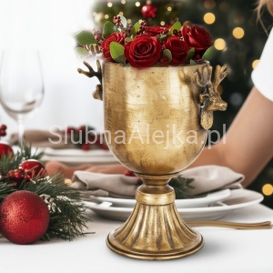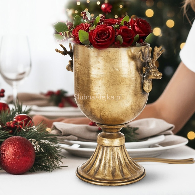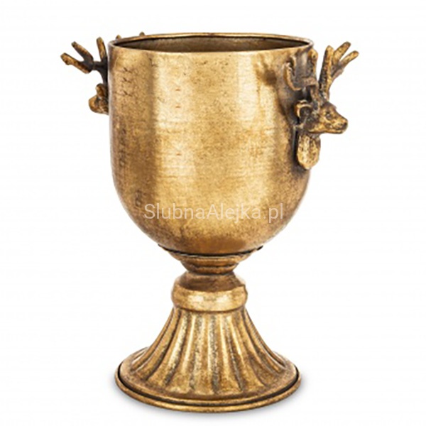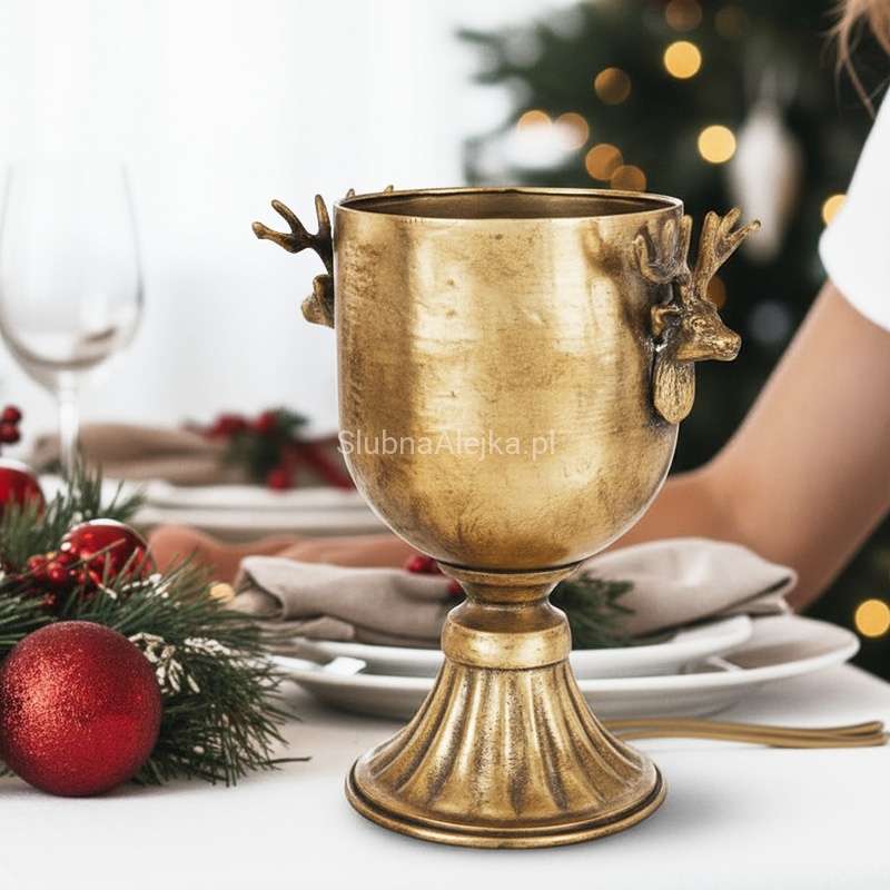 Puchar dekoracyjny złoty to elegancka dekoracja, która cieszy się dużym uznaniem. Dzięki metalowej lekko postarzanej powierzchni i ozdobom w kształcie głów reniferów puchar ten zyskuje elegancki design. Jest to produkt idealny do dekoracji przestrzeni domowj, restauracji, hotelu oraz na różnego rodzaju uroczystości i przyjęcia.