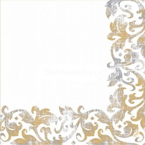 Serwetki flizelinowe Festiva to serwetki najwyższej jakości renomowanej firmy Duni. Wykonane zostały z niecodziennego, wysokiej jakości materiału. Serwetki są białe z wykończeniem w postaci srebrno-złotego przecieranego nadruku. Ich zaletą niewątpliwie jest gruby, sztywny materiał z jakiego zostały wykonane. Znakomicie układają się we wszelkie formy i pozostają niewzruszone przez długi czas. Ich ozdobny, drukowany wzór sprawia, że oprócz praktycznego zastosowania, pełnią również rolę wykwintnej dekoracji. Dzięki temu każde wesele, komunia lub przyjęcie okolicznościowe zyska dodatkowy blask.