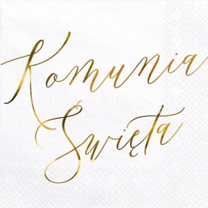Serwetki komunijne papierowe 3 warstwowe ze złotym napisem "Komunia Święta". Można skompletować z nimi girlandy i toppery komunijne, które pięknie podkreślą uroczyste chwile podczas przyjęcia komunijnego.