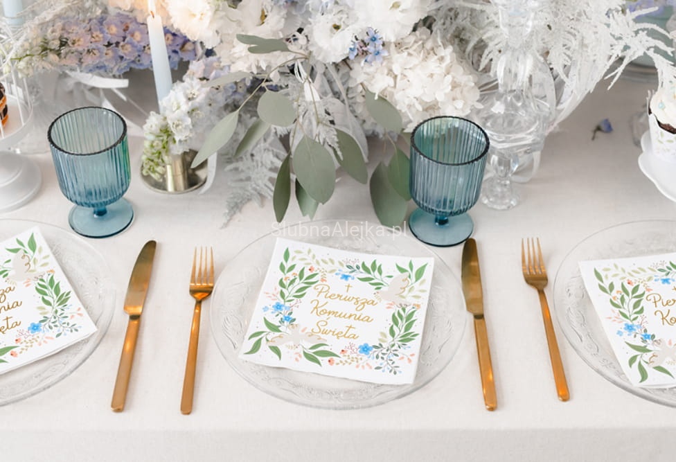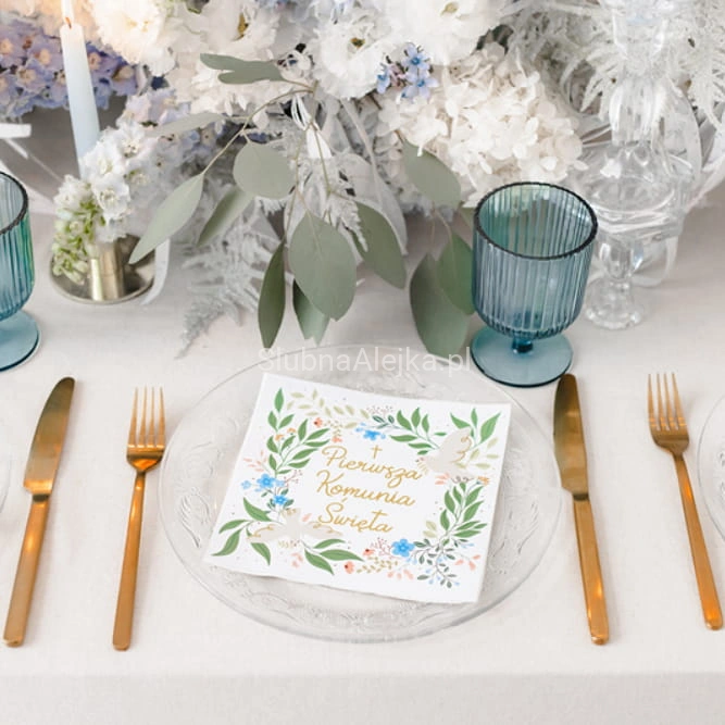 Serwetki komunijne papierowe 3 warstwowe z piękknym kwiatowym wzorem i złotym napisem Pierwsza Komunia Święta. Można skompletować z nimi księgę gości komunijnych, girlandy i toppery komunijne, które pięknie podkreślą uroczyste chwile podczas przyjęcia komunijnego.
