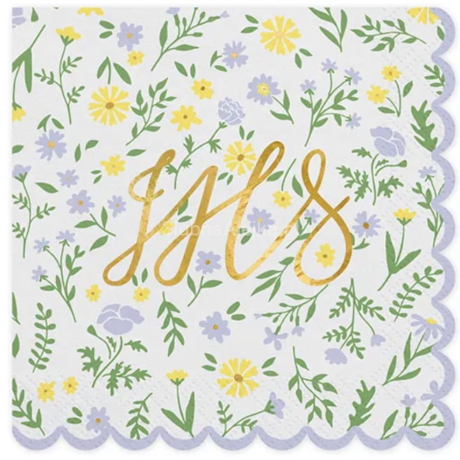 Serwetki komunijne papierowe 3 warstwowe z piękknym kwiatowym wzorem i złotym napisem IHS. Można skompletować z nimi księgę gości komunijnych, girlandy i toppery komunijne, które pięknie podkreślą uroczyste chwile podczas przyjęcia komunijnego.