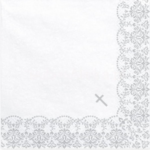 Serwetki komunijne papierowe 3 warstwowe z ozdobnym ornamentem i krzyżykiem. Można skompletować z nimi girlandy i toppery komunijne, które pięknie podkreślą uroczyste chwile podczas przyjęcia komunijnego.