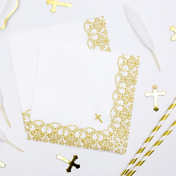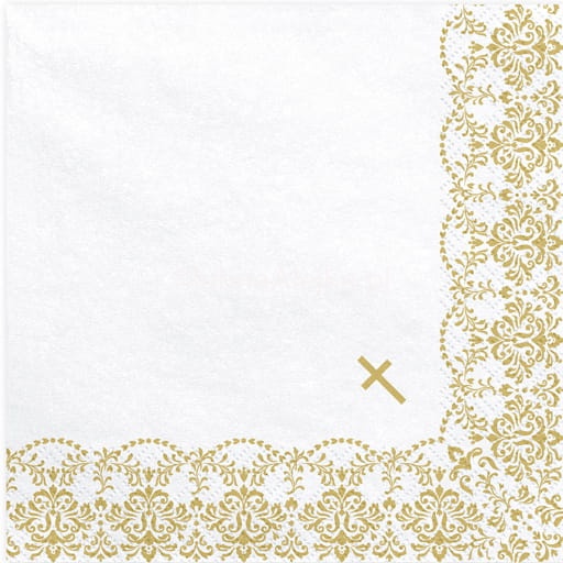 Serwetki komunijne papierowe 3 warstwowe z ozdobnym ornamentem i krzyżykiem. Można skompletować z nimi girlandy i toppery komunijne, które pięknie podkreślą uroczyste chwile podczas przyjęcia komunijnego.