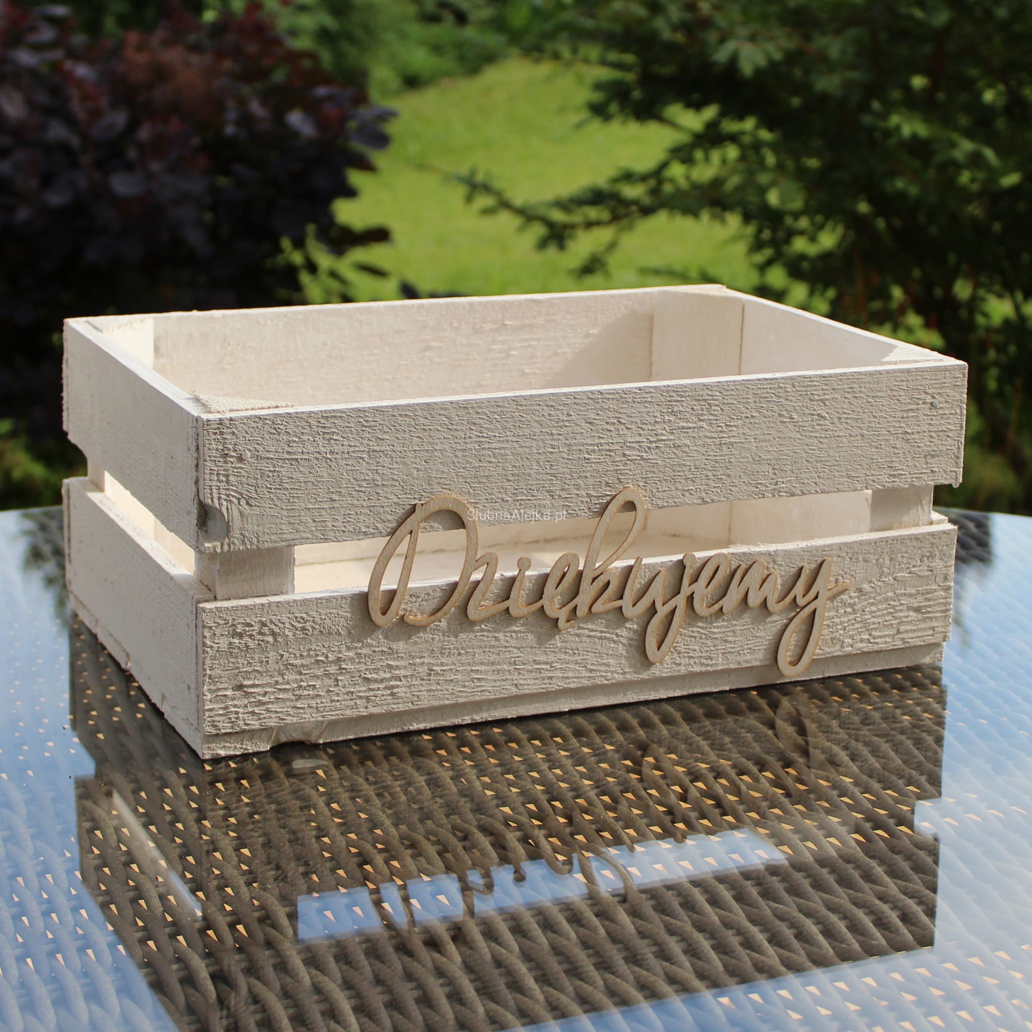 Biała skrzynka wykonana z drewna z napisem Dziękujemy.