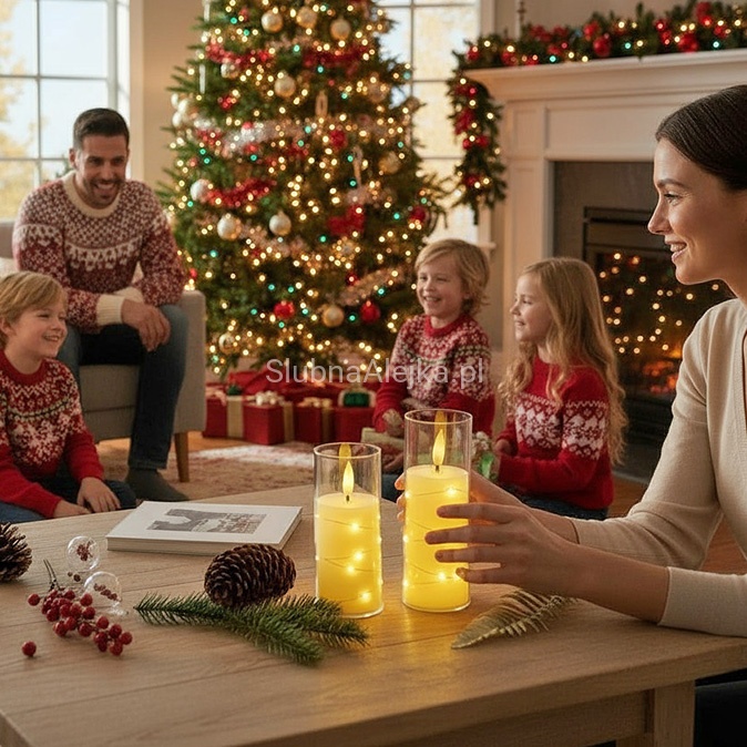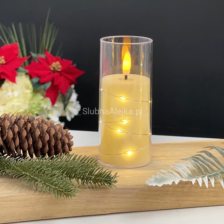 Świeca LED bezpłomieniowa Girlanda to dekoracja, którą można z powodzeniem ustawić jako indywidualną dekorację lub wykorzystać do dekoracji świątecznych wianków. Światło świecy jest ciepłe, a zatem zachowuje wyjątkowo romantyczną atmosferę, dokładnie taką jak w przypadku zwykłych świeczników. Świeca LED opleniona dodatkowo girlandą led, iluminuje przestrzeń sprawiając, że każda uroczystość będzie wyjątkowa i zachowa niezwykły charakter. Dodatkowo jest bezpieczna w użytkowaniu i długo się pali. Sprawdzi się jako wkład do zniczy. Świece LED zakupione w większych ilościach pozwalają skomponować wyjątkową aranżację na sali weselnej lub w kościele. Wykonana z wysokieej jakości tworzywa sztucznego.