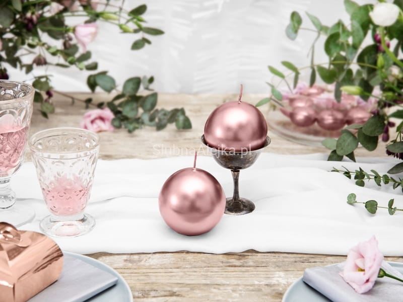 Najmodniejsze w tym sezonie świece metalizowane w kolorze Różowego Złota. Świece kule w naszej ofercie proponujemy Państwu w różnych wariantach i bogatej kolorystyce. Mogą to być większe lub mniejsze rozmiarowo świeczki, w zależności od tego, do czego będą nam potrzebne w aranżacji sali restauracyjnej. Ponadto mogą Państwo wybrać spośród świec metalizowanych, matowych lub lakierowanych. Wszystkie wykonane z największą precyzją i o długim czasie palenia. Aby świece kule stały się wyjątkową ozdobą, wystarczy podłużna podstawka lub szklana misa, aby wykreować niebanalny lampion, używając do tego ozdobnego żwirku, suszonych kwiatów lub motywów świątecznych. Dzięki temu każde wesele, czy przyjęcie okolicznościowe może być w prosty sposób udekorowane, bez dużych nakładów finansowych.