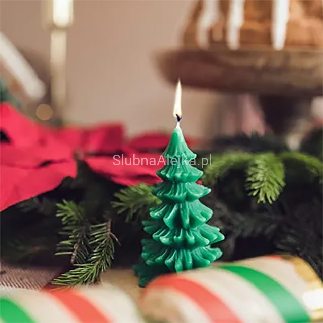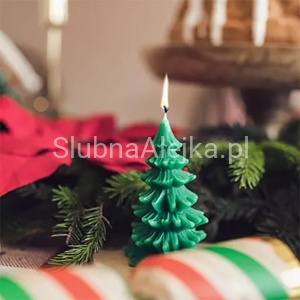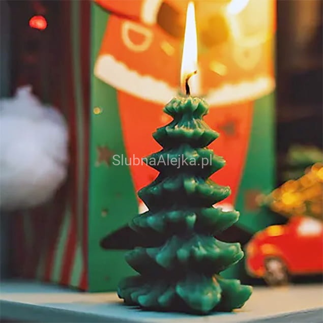 Urocza, pięknie wykonana świeca ozdobna w kształcie choinki. Kolor ciemnozielony wpisuje się w dekoracje świąteczne w stylu naturalnym. Idealna do kompozycji ze świecami pieńkowymi, a także kulistymi. Wraz z kompozycją świec i piasku ozdobnego doda przytulnego świątecznego klimatu. W salonie, sypialni, czy podczas przyjęcia wigilijnego – świece sprawdzą się w każdej z tych aranżacji. W połączeniu z dostępnymi w naszym sklepie szklanymi lampionami oraz dekoracjami np. szyszek, stworzy prostą, ale zarazem bardzo ubogacającą wnętrze dekorację.