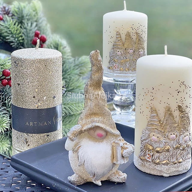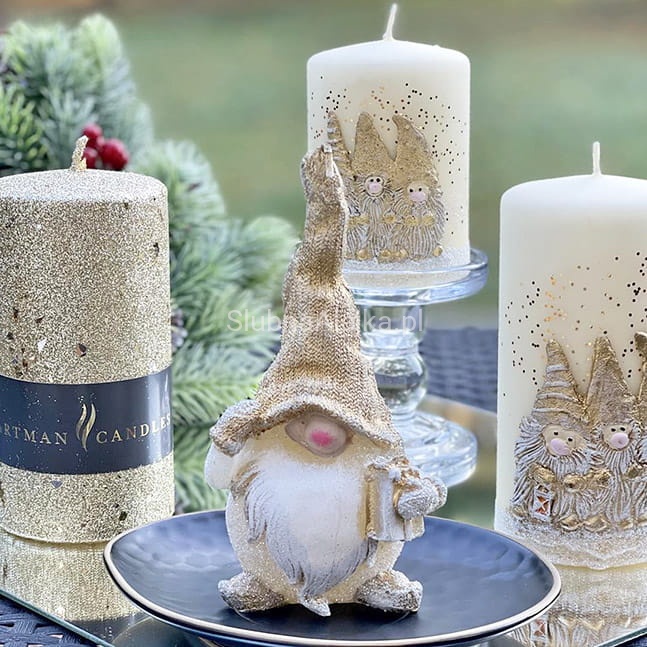 Świeca ozdobna Figurka Gnom zdobiona piękną świateczną aplikacją w kształcie uroczego gnoma wykonaną z lśniącego brokatu. Przepiękny, kręcony wzór w kilku różnych wersjach kolorystycznych do wyboru. Świeca figurka gnom doda przytulnego świątecznego klimatu. W salonie, sypialni, czy podczas przyjęcia – świece ozdobne sprawdzą się w każdej z tych aranżacji. W połączeniu z dostępnymi w naszym sklepie szklanymi lampionami oraz dekoracyjnym piaskiem, stworzy prostą, ale zarazem bardzo ubogacającą wnętrze dekorację. Świetny i bardzo elegancki pomysł na prezent.