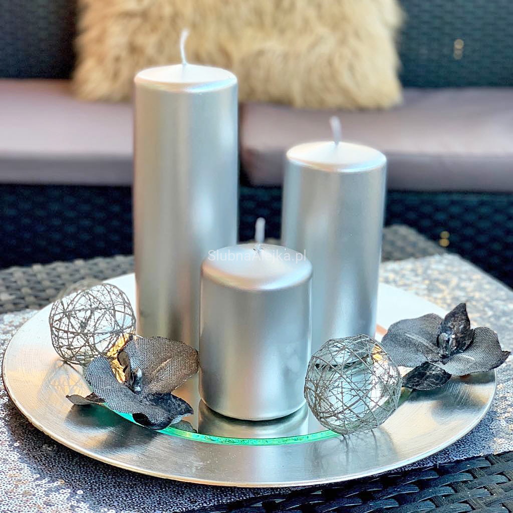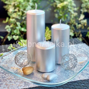 Świeca Ozdobna Pieńkowa Metalik Srebrny to elegancka świeca z metalicznym wykończeniem. Uformowana w walec świeca może być ozdobą samą w sobie, ale także jednym z elementów dekoracyjnych. Znakomicie sprawdzi się jako centralny punkt stroika bożonarodzeniowego, ale także ślubnych kompozycji florystycznych. Można ją także postawić w towarzystwie świec o innych wysokościach na lustrzanym podstawku. Wówczas płomień odbija się w zwierciadle, a cała aranżacja zamienia się w błyszczący lampion. Świece pieńkowe palą się bardzo długo, a zatem możemy przestać martwić się o tę część dekoracji sali. Aby stworzyć prosty świecznik wystarczy ozdobny żwirek, podstawka i świeca. Bardzo często najprostsze rozwiązania są najlepsze i najbardziej oczekiwane. Komplet świec o różnej wysokości może być miłym i praktycznym prezentem dla bliskiej osoby.