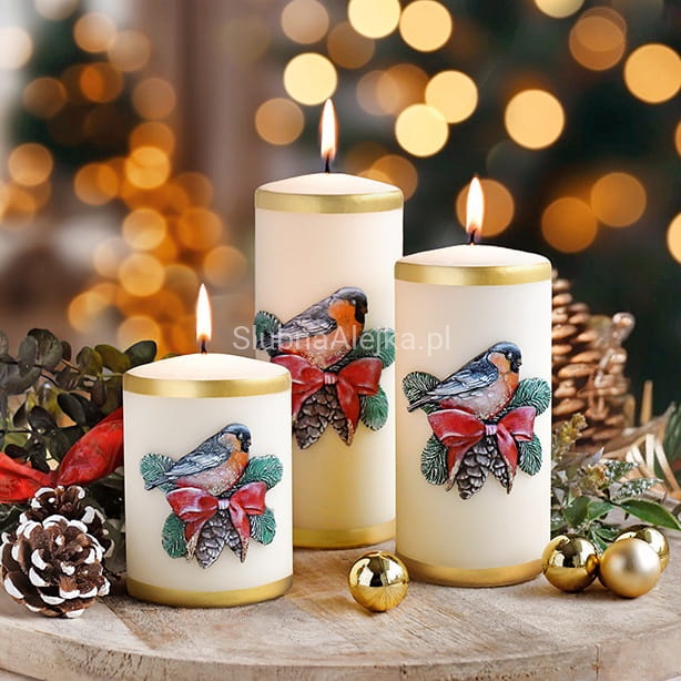 Świeca pieńkowa Świąteczny Ptaszek to wyjątkowo elegancka świeca zdobiona uroczą sikorką. Ma gładką strukturę przez co bardzo wpisuje się w eleganckie wnętrza. Świeca jest w całości biała i pali się bardzo długo równym i jasnym płomieniem. Świeca z serii Ptaszek to atrakcyjny dodatek do większych pomieszczeń, np. salonów i kuchni połączonych z jadalnią. Świece pieńkowe w tym odcieniu idealnie sprawdzą się w czasie organizacji różnego rodzaju przyjęć. Kilka takich świec o różnej wysokości i średnicy bez żadnych dodatków potrafi uformować znakomitą dekorację.
