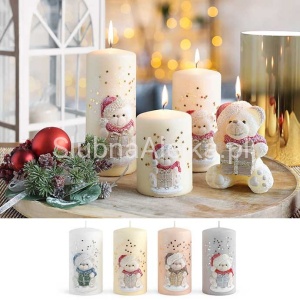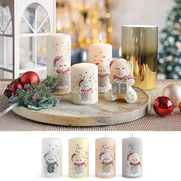Świeca ozdobna, pieńkowa Teddy Świąteczny zdobiona piękną świateczną aplikacją w kształ,cie uroczego misia Teddy wykonaną z lśniącego brokatu. Przepiękny, kręcony wzór w kilku różnych wersjach kolorystycznych do wyboru. Świeca pieńkowa Teddy doda przytulnego świątecznego klimatu. W salonie, sypialni, czy podczas przyjęcia – świece ozdobne sprawdzą się w każdej z tych aranżacji. W połączeniu z dostępnymi w naszym sklepie szklanymi lampionami oraz dekoracyjnym piaskiem, stworzy prostą, ale zarazem bardzo ubogacającą wnętrze dekorację. Świetny i bardzo elegancki pomysł na prezent.